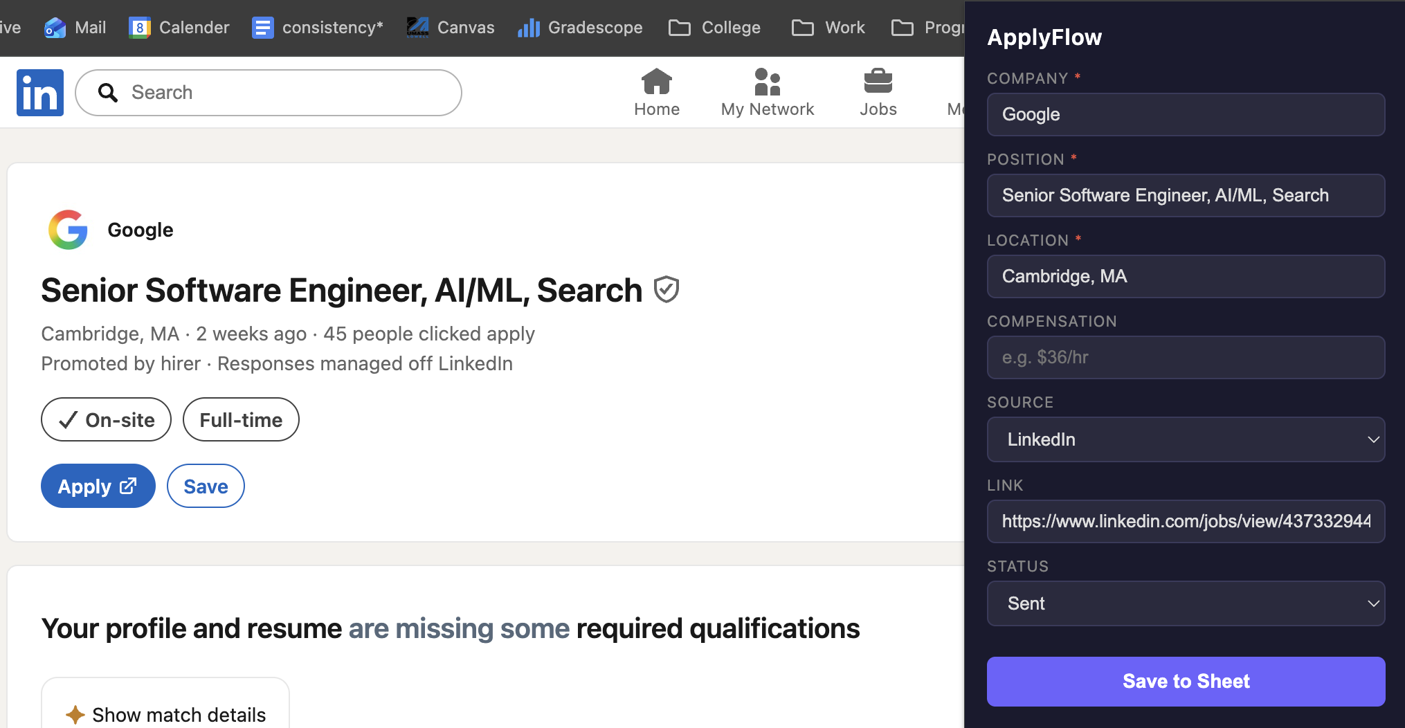 A Chrome extension that detects and parses job postings directly from the page, extracting key fields and saving them to a users Google Sheet.