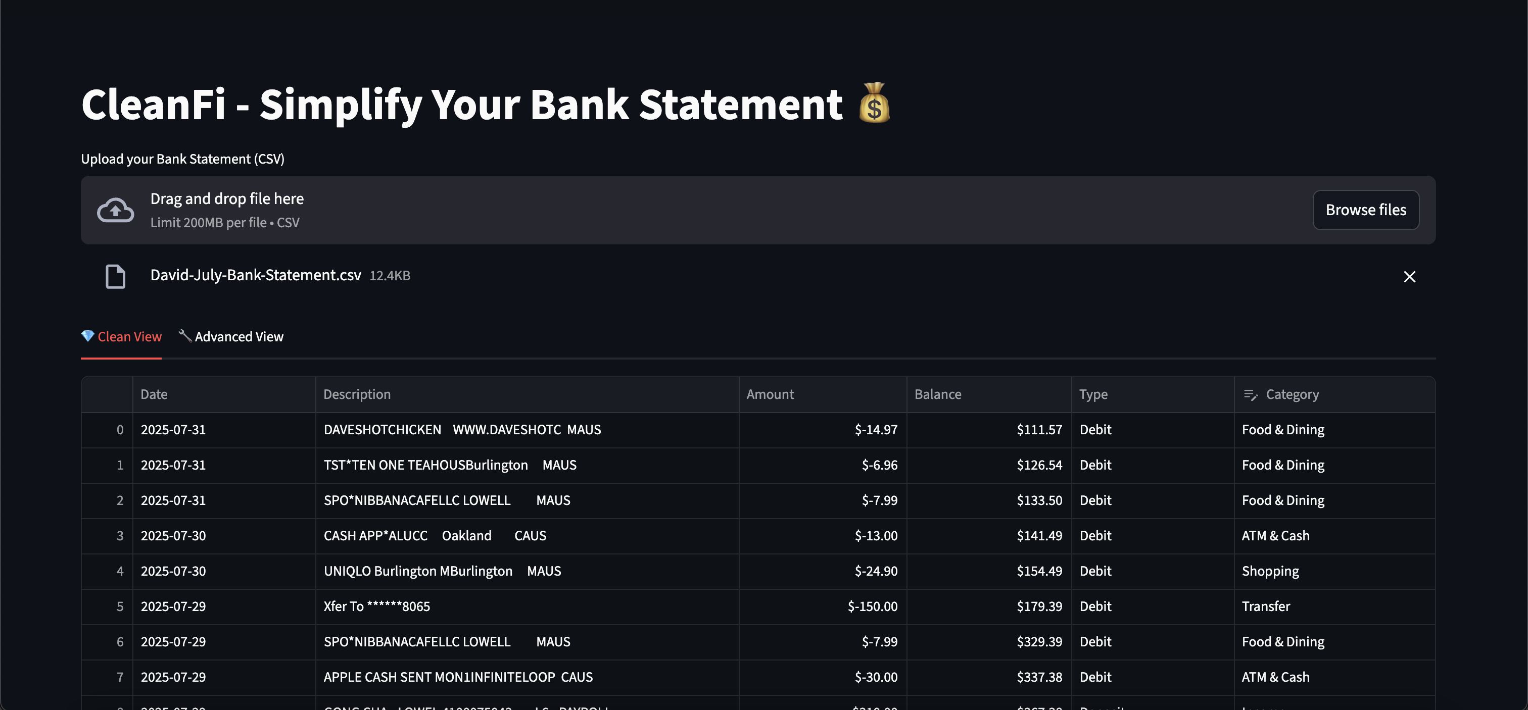 A web application that processes and standardizes bank statement CSVs, automatically cleaning and transforming raw financial data into analysis-ready formats.